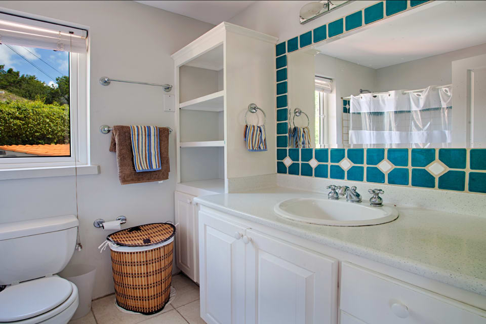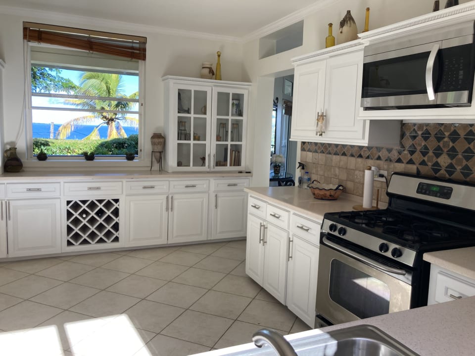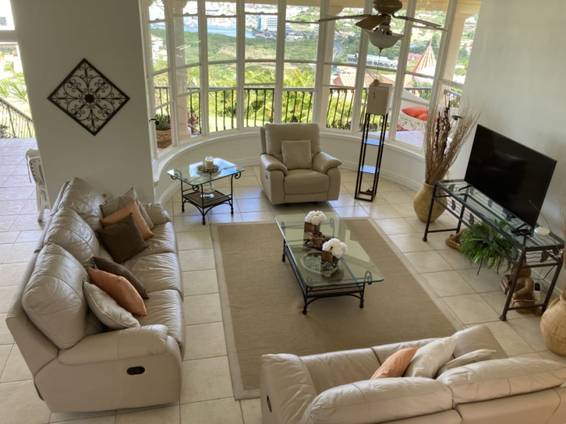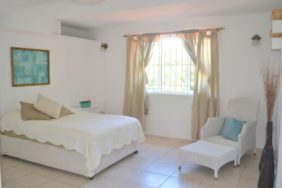 There is a small powder room off the main entrance hallway. The front garden may be directly accessed via the living spaces, and is suitable for entertaining. Near the entrance to the villa is a self-contained apartment, with a kitchen/living area and a separate air conditioned bedroom with a double bed and a separate en-suite bathroom. The ground floor level of the main house also boasts a functional home-office, and a guest room with an en-suite bathroom. Upstairs there are three air conditioned bedrooms, all with en-suite bathrooms. The spacious master bedroom faces due north, with an even better view of the ocean and Pigeon Island. Additional features of the home include an Observatory, automated entrance gate, large basement storage, and a garden shed.
