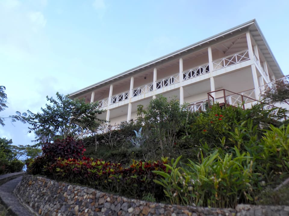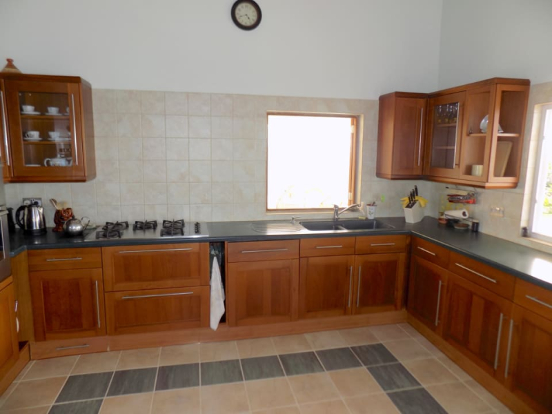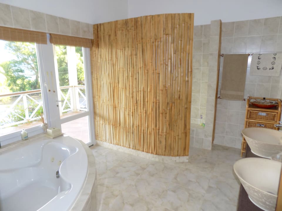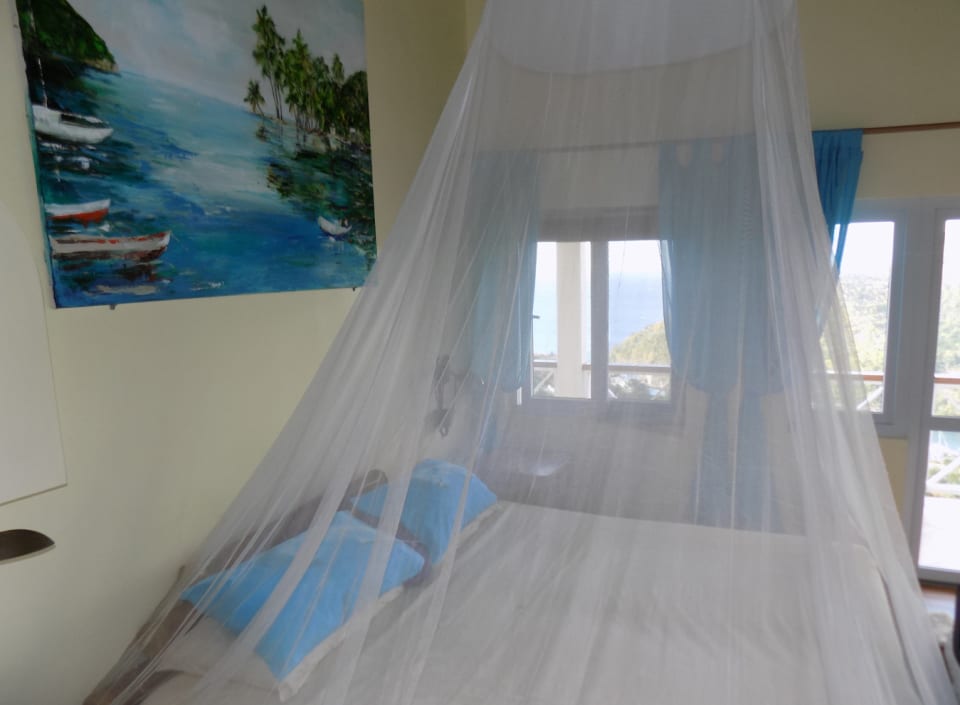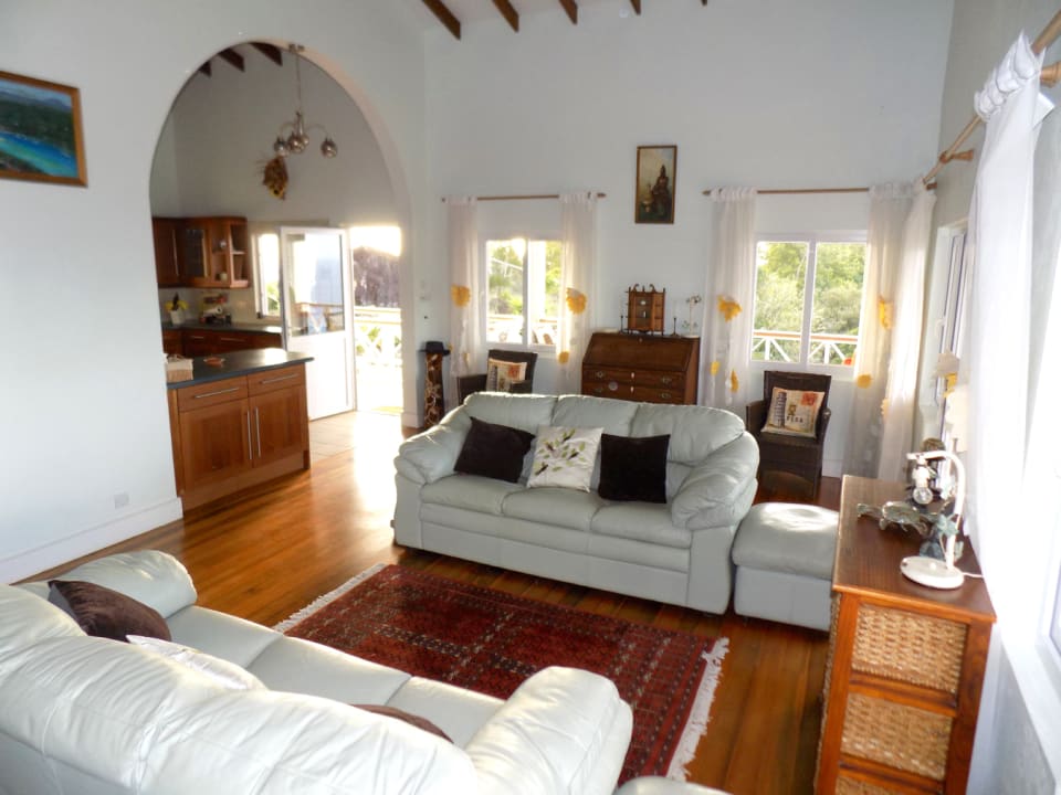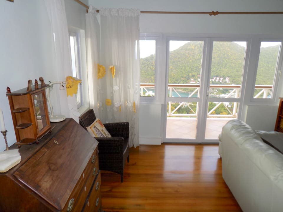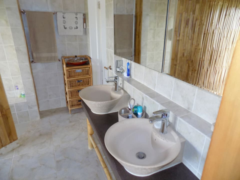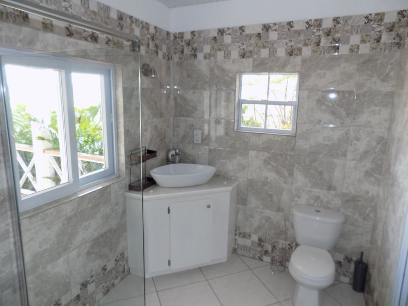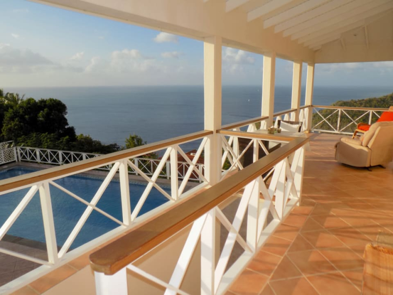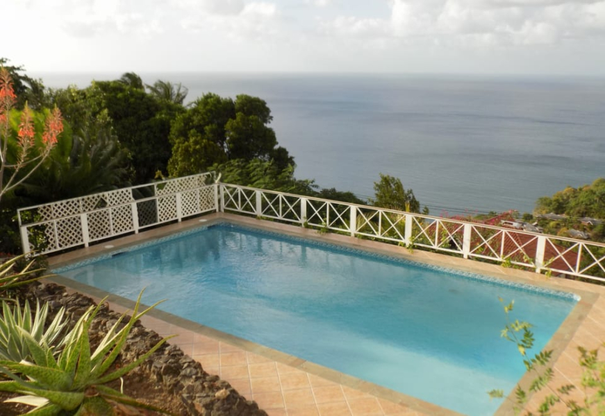 Kayansyel Villa For Sale is situated on two plots of land comprising approximately ¾ Acres, on the highest ridge overlooking Marigot Bay. Both plots of land enjoy stunning panoramic views, especially the one the house is built on, which has truly amazing 360° views. The construction of the house was started in January 2004 and was basically complete by the end of September 2004. The house consists of three bedrooms each with their own en-suite bath/shower room. The upper level (first floor) has terraces surrounding the house, some covered and some not. There is also a small section of garden, with a garden shed at this level. Enjoying the best views at this level is the master bedroom, which has a walk-in closet, en-suite bathroom with a corner Jacuzzi tub and large shower, double vanity & wash-basins. Also present is a study, which may be converted into a fourth bedroom, for additional guest accommodation. The villa features a good sized sitting room and kitchen, large inside/outside dining room, with a nearby cloakroom and utility room. The accommodation on the lower level (ground floor), consists of two bedrooms each with their own bathroom. There is a living area between the bedrooms, which has a small linear galley kitchen on the back wall; allowing this section to become self-contained. There are also two storage rooms and a laundry room. This level has covered terraces on three sides, along with a large uncovered area of tiled pool deck with hot and cold shower. The pool measures 36′ x 18′ with a depth ranging from approximately 3′ to 8′ deep. Below the pool deck is a small room that houses pool equipment and generator. The house has water storage in two separate tanks, with a total capacity of 25,000 gallons. From the access-road there is a moderately steep, but short drive leading onto a flat parking/turning area, with double car port and enclosed work bench and more storage areas.