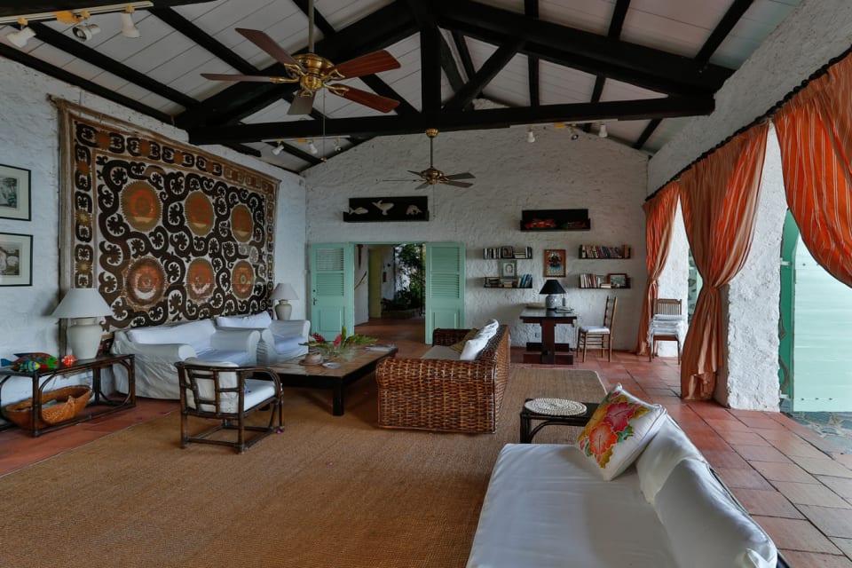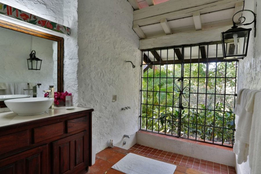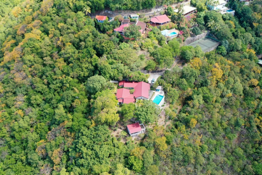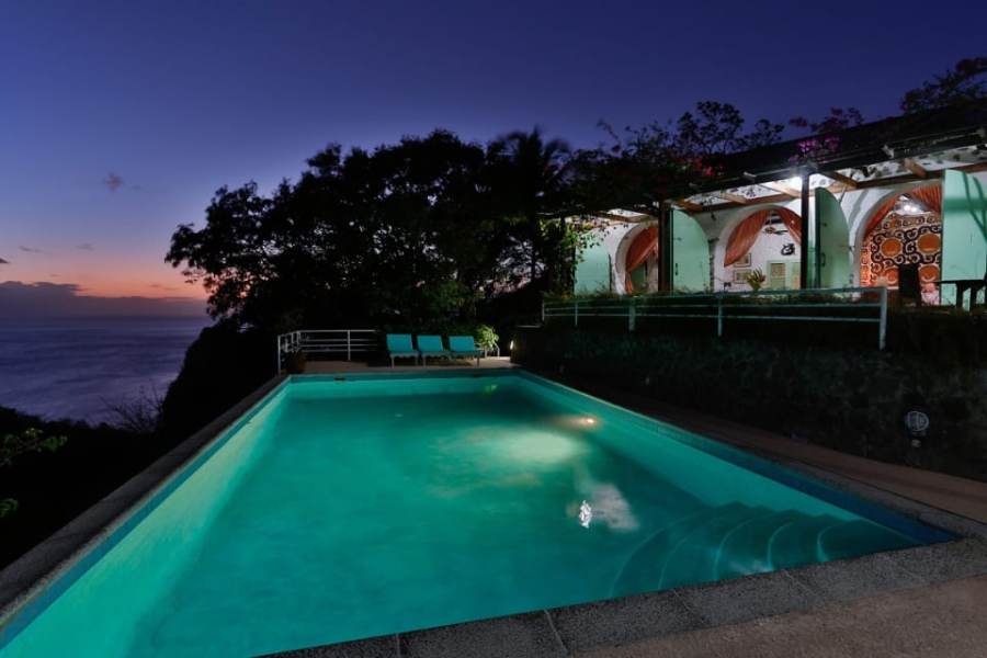 Red roofs, thick island stone walls, and graceful archways set the tone for this distinctive Mango Point Villa For Sale, nestled in the prestigious Anse Chastanet neighbourhood. Trade winds cool the house at 300 feet above seal level; the home opens all its doors towards the sea, looking out over a tropical garden. Entering the house into the living room you are irresistibly attracted by the large arched doors framed by bougainvilleas, and high cathedral ceilings with hand-carved island wood beams. There are separate wings for sleeping, dining, cooking and leisure which are wrapped around a courtyard shaded by frgfrant jasmine vines. Just off the living area, five steps down is the 32-foot x 16-foot private pool which seems almost suspended at the edge of the hillside, with views sweeping across the Soufriere Bay, Caribbean Sea, and Piton mountains. The large kitchen is Mexican tiled and is well-equipped with an adjacent laundry room. The dining room and living room feature imported Ralph Lauren furniture, while the bedrooms have a West Indian feeling. Two of the master bedrooms have colonial king sized mahogany beds. A few steps down in the garden is the third master suite, Creole-style, with a queen size bed; this room enjoys magnificent views from its private deck. The bathrooms are all spacious with three walls, showers and separate toilets. The palm-lined Anse Chastanet beach is only a 15-minute walk down from the villa. It is a reef paradise for divers and snorkelers. This home also has an excellent rental